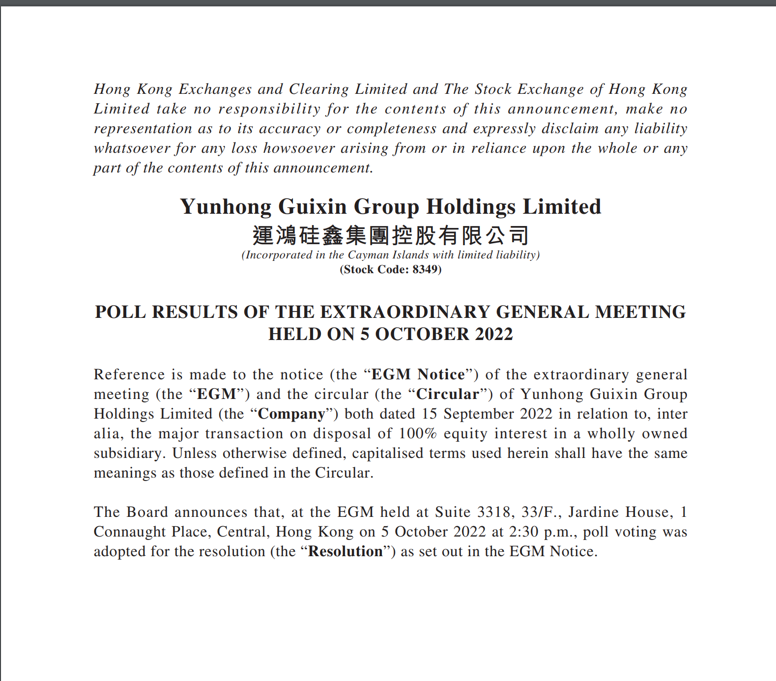 POLL RESULTS OF THE EXTRAORDINARY GENERAL MEETING HELD ON 5 OCTOBER 2022